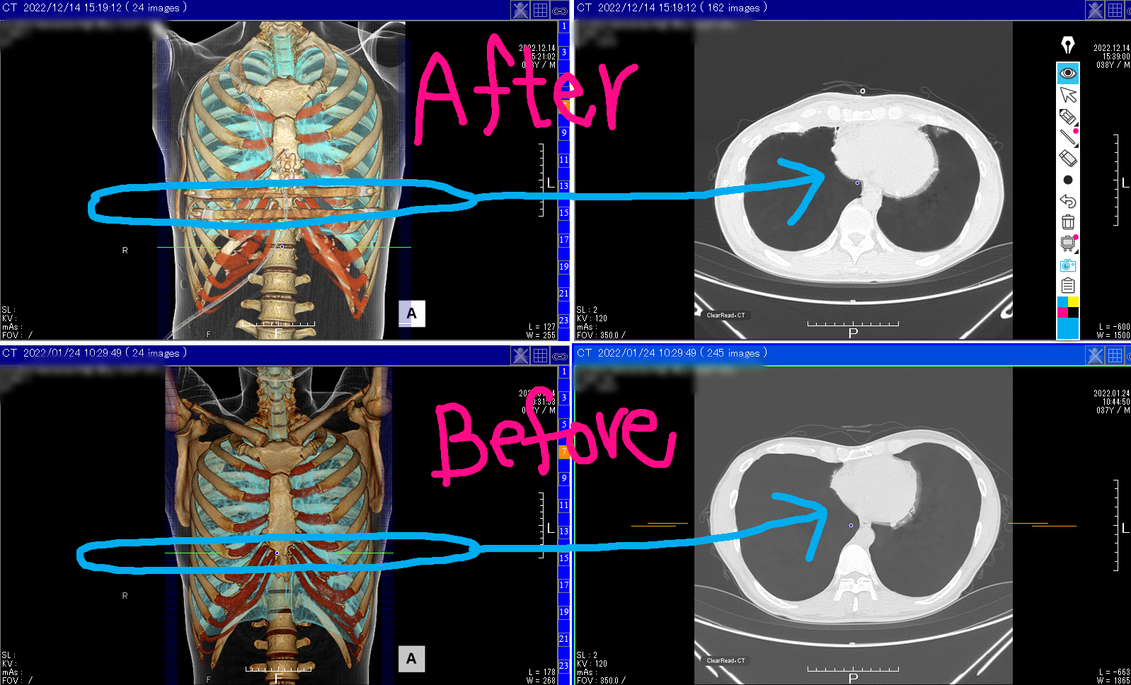 CT画像を見ると心臓は大きくなっているように見えます。しかしもしかしたら、CT画像を撮る前に思い切り息を吸って止めた状態で写真を撮るのですが、術後は痛みで思い切り息を吸うのが少し甘かったのかもしれません。
