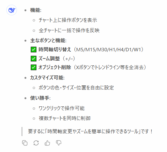 【MT4】ワンクリックで全チャートの時間軸切り替えやズーム変更&オブジェクトの全削除を行えるインジケーター FX 2025.05.13 プログラミングはまったく出来ないのですが最近登場したAIによってMT4のインジケーターが作成出来るようになりました🤖 ワンクリックで全チャートの時間軸やズーム変更&オブジェクトの全削除を行えるものですが、AIは触っているだけでも楽しいです🥰