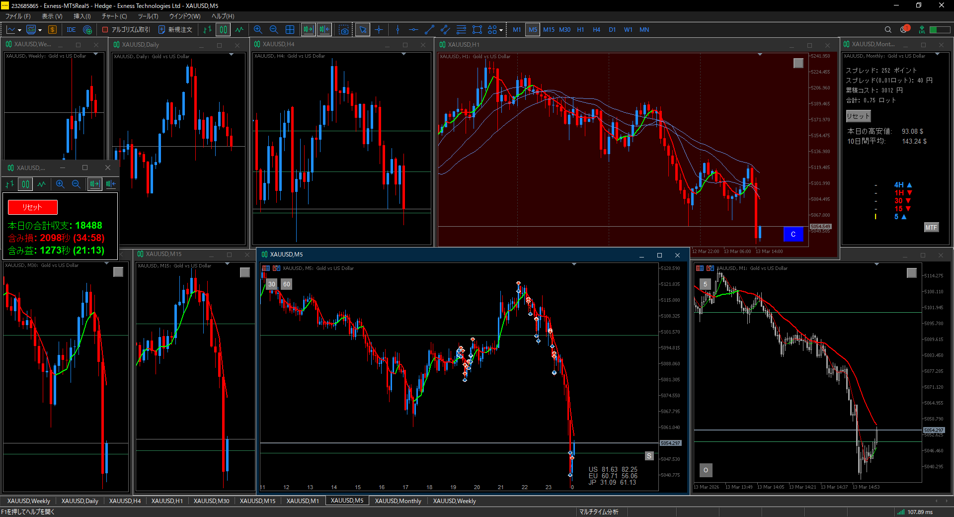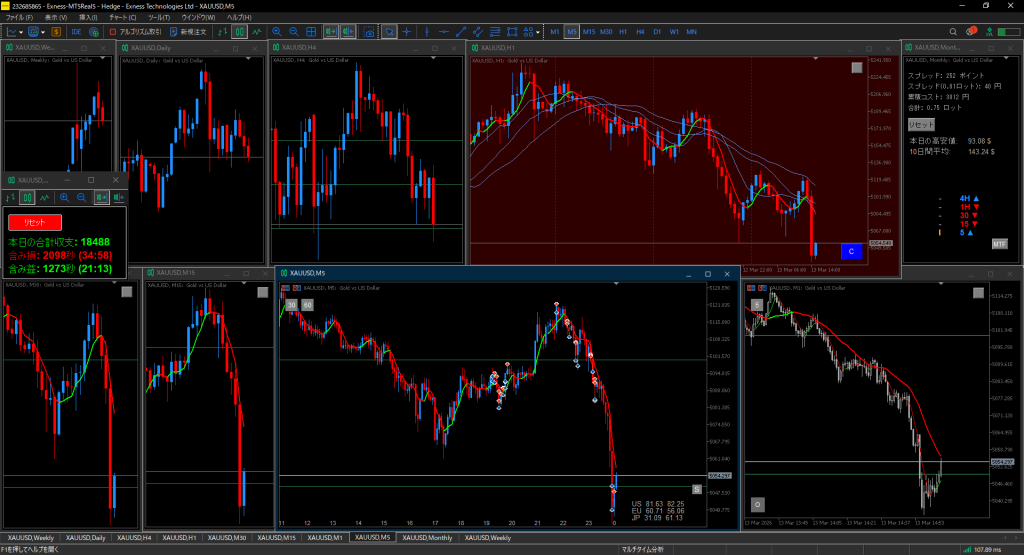 2026.3.13(金) +18488円 トレード 2026.03.14 タイトル: 2026.3.13(金)トレード 本日の合計収支: 18488円 取引手数料: 3012円(累積コスト) 取引合計ロット: 0.75 ロット 含み益の時間: 21:13 (1273秒) 含み損の時間: 34:58 (2098秒)